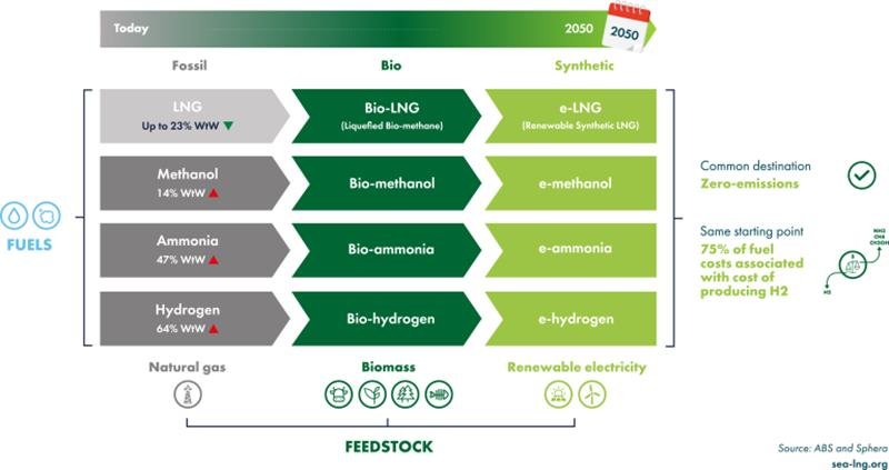 - Bio-LNG is the lowest cost renewable, or green fuel, significantly cheaper than bio-methanol.