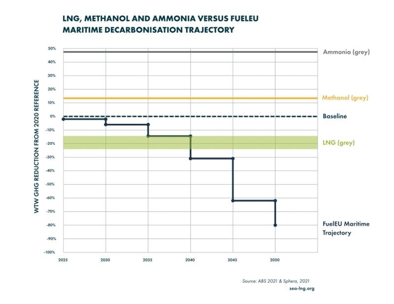 - GHG savings for LNG are assumed at 20% – representative of the two-stroke engine technologies used on these vessels.