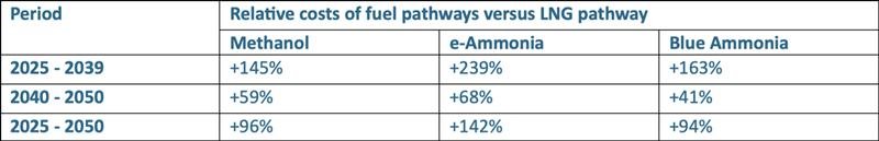 From simple visual inspection, we can see that the LNG pathway is significantly lower cost than both the methanol and ammonia pathways. The table below shows this in terms of percentage cost increases of the different pathways compared with the LNG pathway – also including the blue ammonia pathway (ammonia produced from natural gas using carbon capture and storage).
