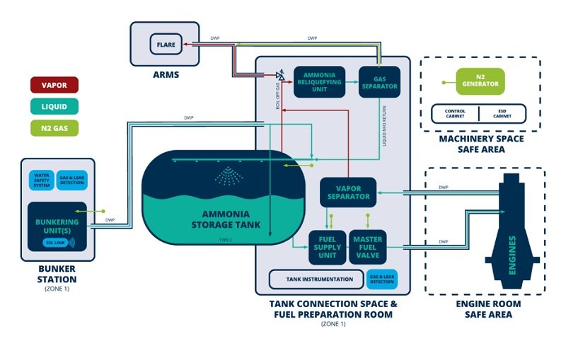 The Ammonia Fuel System is engineered to meet rigorous safety, design, and material standards. It is adaptable for use with both two-stroke and four-stroke engines, as well as other ammonia-consuming applications. Key safety features of the system include advanced gas and leak detection, ammonia capture, reliquefying, and ammonia release mitigation (ARMS) functions. Additionally, Auramarine will offer full and ongoing training to ensure safe operation and maintenance as part of its lifecycle services.