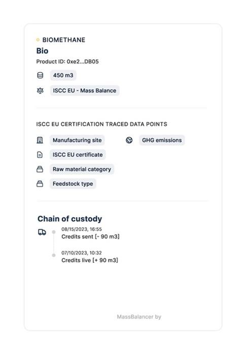 A screenshot of the MassBalancer tool showing a specific stream of biomethane, its certification data points and chain of custody.
