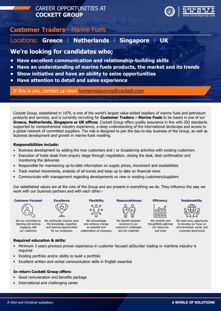 Cockett Group, established in 1979, is one of the world’s largest value-added resellers of marine fuels and petroleum products and services, and is currently recruiting for Customer Traders – Marine Fuels to be based in one of our Greece, Netherlands, Singapore or UK offices. Cockett Group offers quality assurance in line with ISO standards supported by comprehensive industry experience, a deep understanding of the international landscape and access to a global network of committed suppliers. The role is designed to join the day-to-day business of the Group, as well as business development and growth in marine fuels reselling.