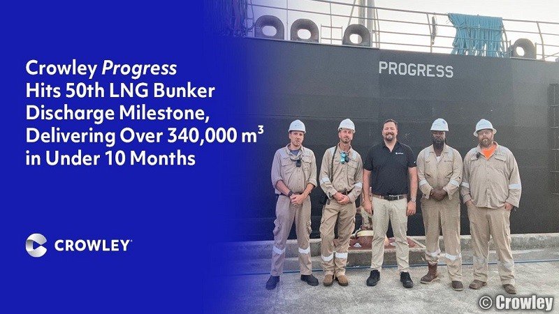 Jacksonville, Florida – July 10, 2025 — Leading U.S.-owned logistics, marine, and energy solutions company Crowley has announced that its LNG bunker barge Progress has completed its 50th bunkering operation, marking a major milestone in the company’s mission to deliver cleaner marine fuel solutions. In less than ten months of operation, Progress has safely delivered over 340,000 cubic meters of liquefied natural gas (LNG), enabling low-emission shipping at one of the most strategically important U.S. ports.