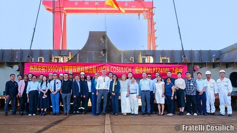 Genoa, Italy | October 22, 2025 – Fratelli Cosulich Marine Energy proudly marks another key milestone in its ongoing fleet expansion with the keel laying of the Lucia Cosulich, held on October 9, 2025, at the Taizhou Maple Leaf Shipyard in China. This ceremony follows the successful steel cutting earlier this year and represents the moment the vessel’s structure begins to take shape, symbolizing a tangible step toward realizing a new generation of safe, efficient, and methanol-ready bunker tankers.