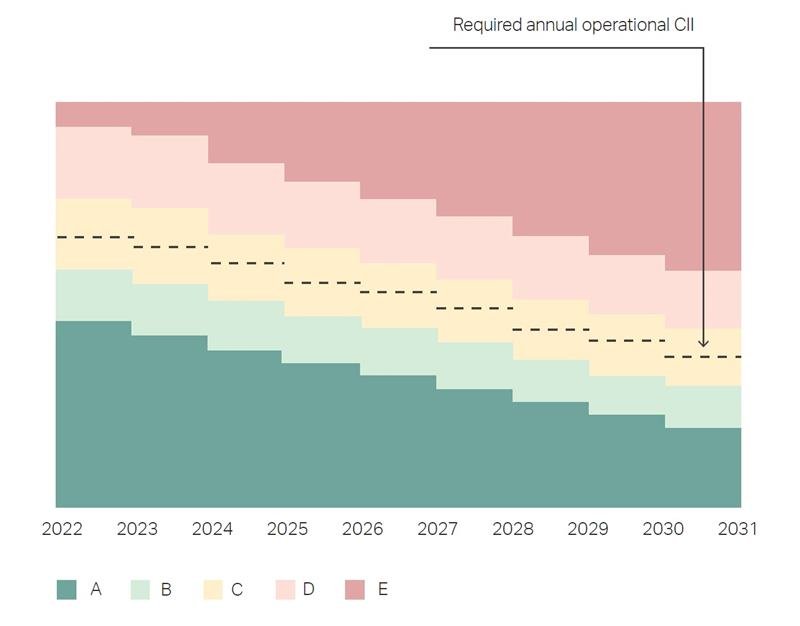 Under the CII, ships fuel consumption and distance traveled are reported each year to the IMO, then converted to a carbon intensity rating from A (lowest intensity) to E (highest intensity). Each year, the CII value required to achieve a certain rating decrease, meaning that the regulation becomes more stringent over time.