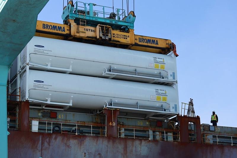 The ISO tanks’ move to JAXPORT was coordinated by logistics and freight forwarding company JF Moran, with stevedoring services provided by terminal operator SSA Atlantic. Local tank trucking provider Patriot Logistics transported the tanks to Eagle LNG’s Maxville LNG Facility in North Jacksonville.