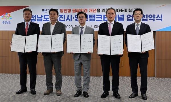 LX International’s CEO, Yoon Chun Sung, POSCO INTERNATIONAL’s CEO, Jeong Tak, Dangjin Tank Terminal’s CEO, Kim Jun Hyoung, Chungcheongnam-do Governor Kim Tae Heum, and Dangjin Mayor, Oh Seong Hwan gathered at the Chungcheongnam-do Provincial Office on the 31st and signed the memorandum of understanding (MOU) for the construction of the Dangjin LNG Terminal.