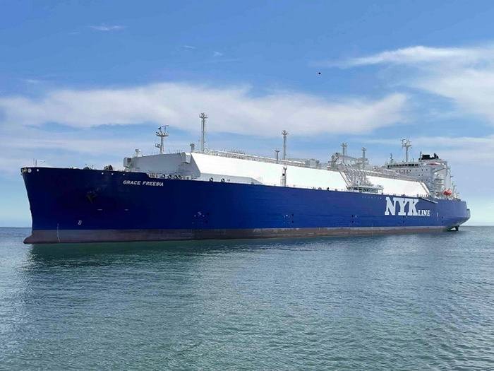This vessel, named “Grace Freesia,” comes equipped with a WinGD-made dual-fuel slow-speed diesel engine (i.e., X-DF diesel engine) that has superior fuel-consumption efficiency and can operate on marine gas oil or boil off gas stored in the cargo tank. The carrier also features a re-liquefaction system that can use surplus boil-off gas efficiently. The cargo tank is a 174,000 cubic meter capacity membrane-type tank that makes use of advanced insulating materials to suppress the boil-off rate (percentage of gas volume that vaporizes during navigation) in the cargo tank and realizes significantly more efficient, economical, and environmentally friendly operation.