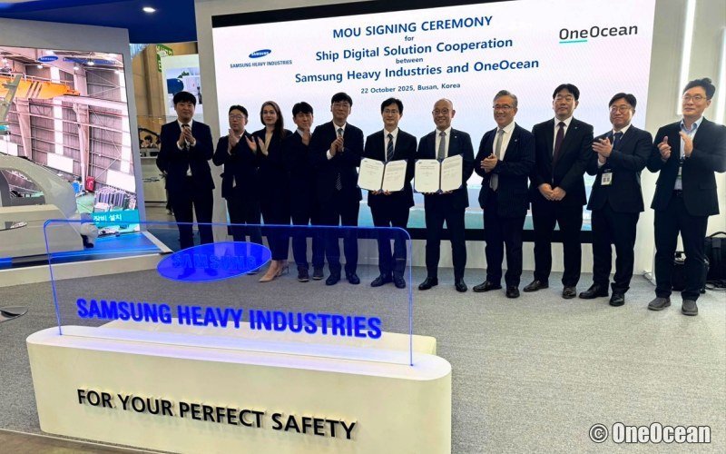BUSAN, KOREA | November 11, 2025 – Global digital solutions provider OneOcean, owned by Lloyd’s Register, and shipbuilding giant Samsung Heavy Industries (SHI) have officially signed a Memorandum of Understanding (MOU) to collaborate on cutting-edge digital and data solution technologies. The partnership is set to drive significant advancements in vessel lifespan performance modeling and enhance voyage optimisation services, with a direct and positive correlation to better fuel management and bunker efficiency across SHI-built vessels.