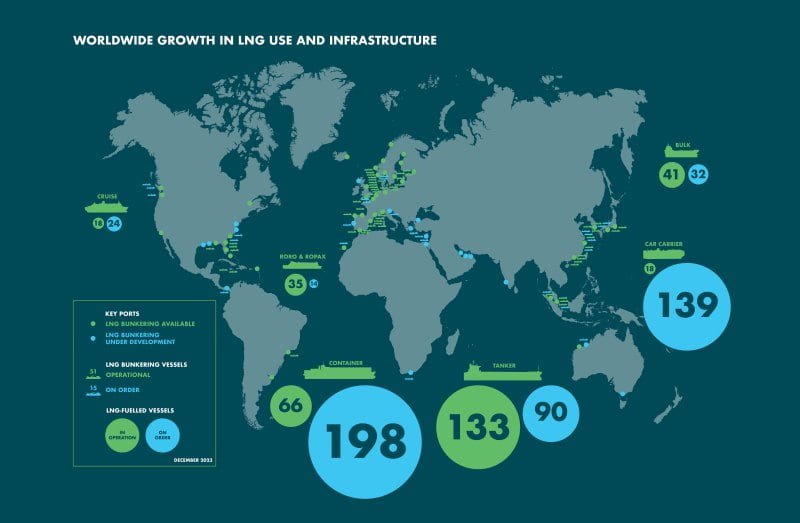 LNG Bunkering Infrastructure: The global infrastructure for LNG bunkering has expanded considerably, with 188 ports offering LNG bunkering services and an additional 82 locations under active discussion. The number of LNG bunker vessels has increased from 40 in 2022 to 50, with 34 more on order or under discussion. This growth reflects the industry’s commitment to supporting LNG as a marine fuel.