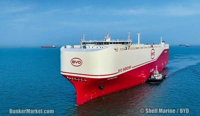 Singapore, May 2025 — Shell Marine has successfully bunkered the world’s largest LNG-powered car carrier, the BYD SHENZHEN, during its maiden voyage. The massive vessel, which is transporting over 7,000 BYD electric vehicles (EVs), set sail from Singapore on its way to Brazil, marking a significant milestone in both the maritime and electric vehicle industries.