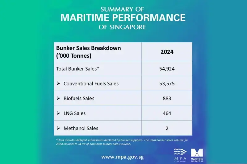 - Methanol: methanol bunkering sales was 2,000 tonnes in 2024. following its debut in the market in 2023. The introduction of methanol as a marine fuel highlights Singapore’s commitment to diversifying its fuel offerings and supporting green shipping initiatives.