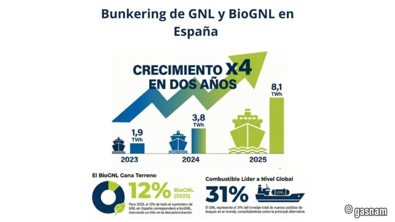 Madrid, Spain | January 21, 2026 – New data released by Gasnam-Neutral Transport confirms that the Iberian Peninsula has achieved a “industrial-scale” breakthrough in the alternative fuels market. In a landmark 24-month period, LNG bunkering volumes across Spanish ports have surged fourfold, exceeding 8.1 TWh in 2025.