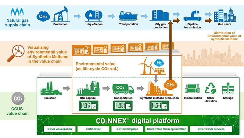 CO2NNEX™ is a digital platform created for CCUS (CO2 capture, utilization and storage) aimed at connecting CO2-related ecosystems and accelerating the expanded use of environmental value. Under the current initiative, CO2NNEX™ will be applied to visualize original information on CO2 and hydrogen – the materials from which synthetic methane is made – and the CO2 emission volumes generated throughout synthetic methane’s lifecycle, from production to transport, supply and combustion. By providing this traceable data, a shared platform will be developed for realizing visualization of synthetic methane’s environmental value. The project also aims to incorporate future enhancement of trade – for example, through transfer of synthetic methane’s environmental values – and to develop a system to serve as an industry standard usable by other manufacturers of synthetic methane.