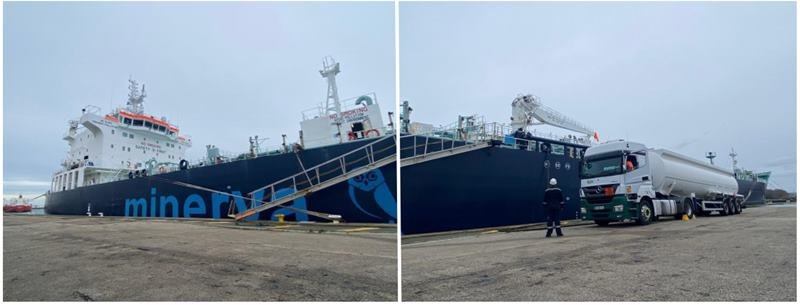 In the first trial, at the Port of Le Havre, the TotalEnergies-chartered tanker “Minerva Tychi” was supplied with 200 MT of a bio-marine gas oil (MGO) blend on January 3rd. The blend was composed of MGO and 30% second-generation, sustainable, waste-based and ISCC-certified UCOME (Used Cooking Oil Methyl Ester), via truck-to-ship transfer.