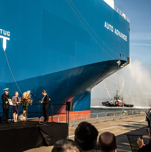 The christening of the Auto Advance was performed in traditional manner by Mrs. Lister with the cracking of a champagne bottle on the hull to a fanfare of vessel horns and a tugboat spraying water, while the Auto Aspire was named in a virtual ceremony.