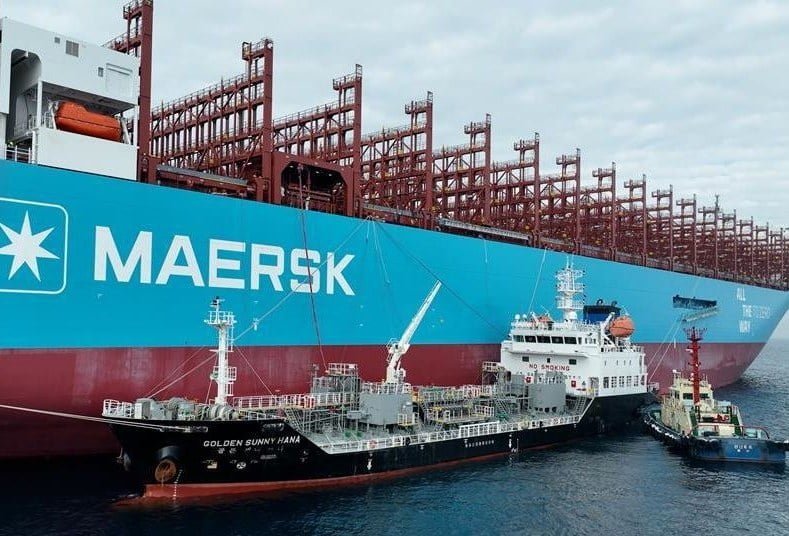 ANE MAERSK, the world’s first large methanol dual-fuel containership, celebrated its maiden ship-to-ship (STS) green methanol bunkering at Ulsan Port. The bunkering operation, completed by the bunker vessel Golden Sunny Hana owned by Hana Marine, highlights Korea’s commitment to fostering sustainable marine fueling in its ports.