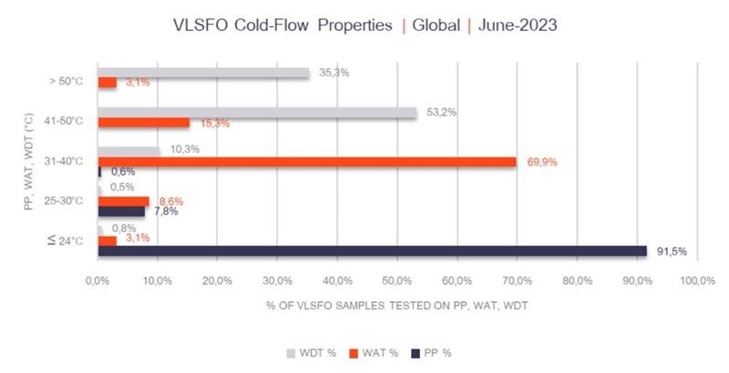 Present global averages indicate a VLSFO pour point of 16°C, with an average WAT of 38°C and average WDT of 48°C. These figures underscore the inadequacy of using +10°C above the pour point as a gauge for cold-flow properties in VLSFO blends, rendering it insufficient and an inappropriate risk mitigation measure.
