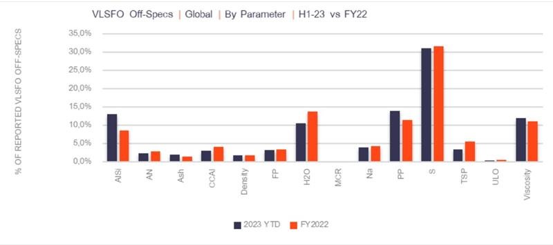 Sulfur off-specification stands as the most prevalent among all VLSFO off-specifications, contributing to over 30% of all instances. However, recent test results demonstrate an improvement in sulfur off-specification compared to the state in 2021. Presently, only 1.6% of tested VLSFOs exceed the 0.50% sulfur limit, as opposed to 2.4% in 2021.