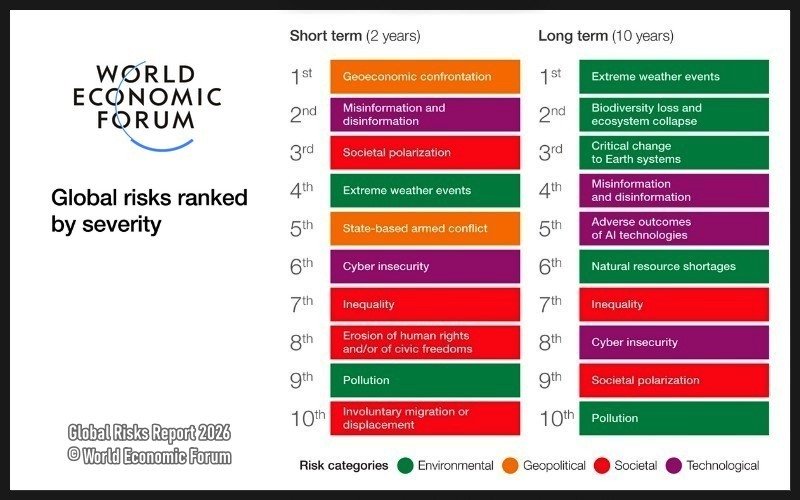 However, this shift reflects prioritization rather than reduced danger. Over the 10-year horizon, environmental risks remain the most severe globally. Extreme weather, biodiversity loss and critical changes to Earth systems occupy the top three positions.